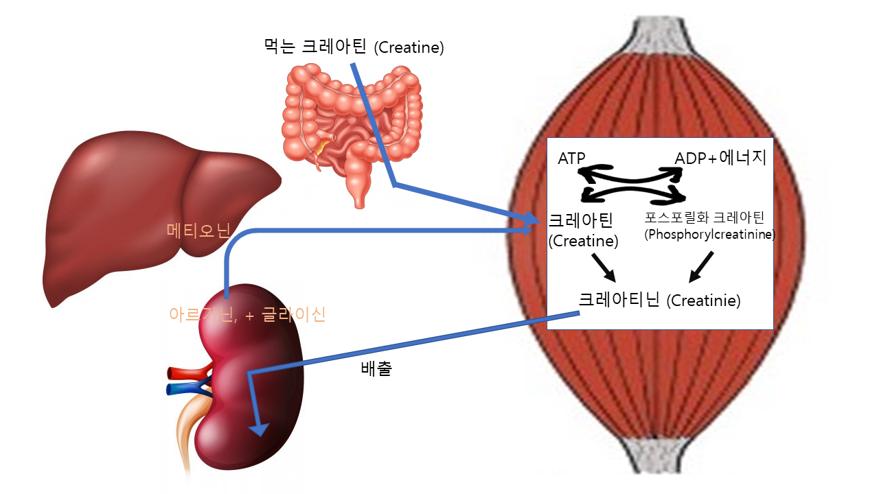 일단 크레아틴은 의료기관 건강검진할 때 신기능검사를 하는 크레아티닌(Creatinine) 이라는 혈액수치와 매우 밀접한 관계가 있다. 일단 그림을 보자.